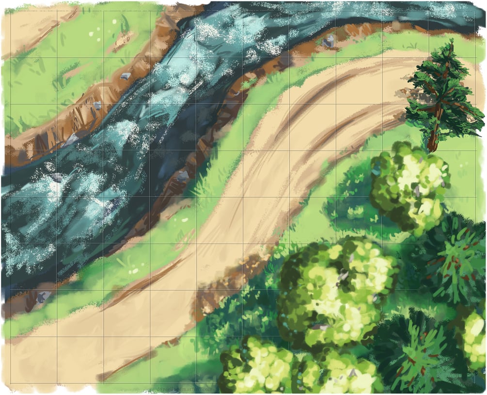 Gridded and gridless files for virtual tabletop play, clear road and felled tree variants.